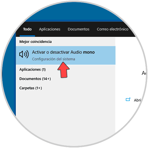 Para esto buscamos "mono" en Inicio y en el listado desplegado abrimos “Activar o desactivar Audio mono":
