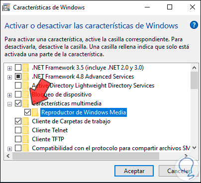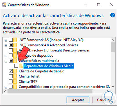 Damos clic en "Activar o desactivar las características de Windows" y en la ventana emergente vamos a la sección "Características multimedia", observaremos lo siguiente: