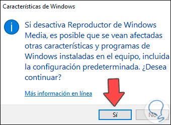 Desactivamos la casilla "Reproductor de Windows Media" y veremos el siguiente mensaje: