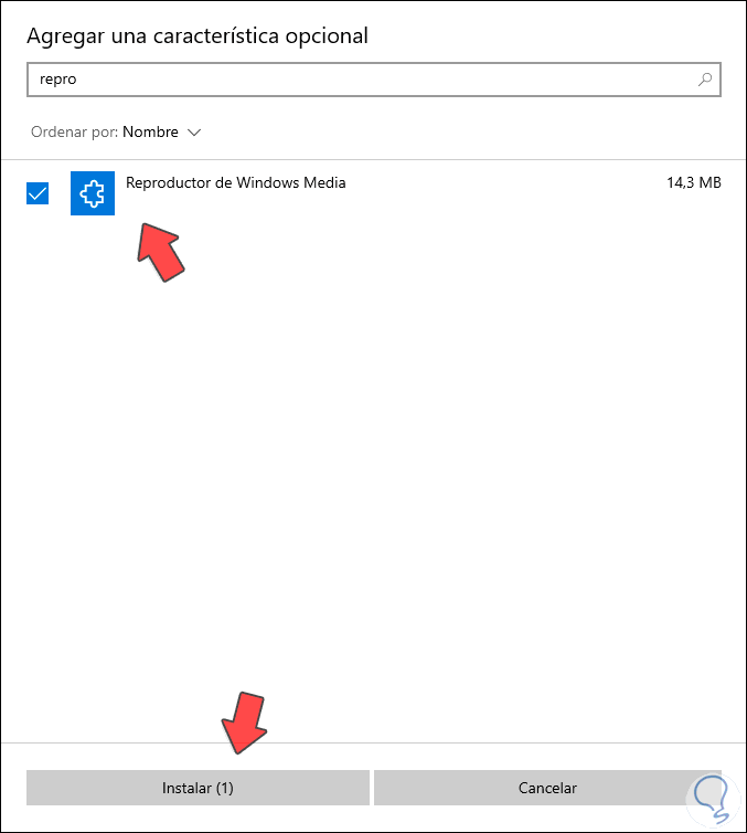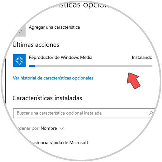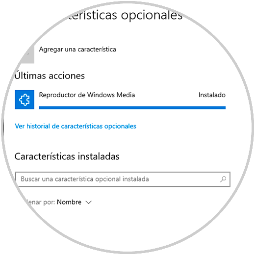 Allí damos clic en "Agregar una característica" y en la ventana emergente seleccionamos el "Reproductor de Windows Media":