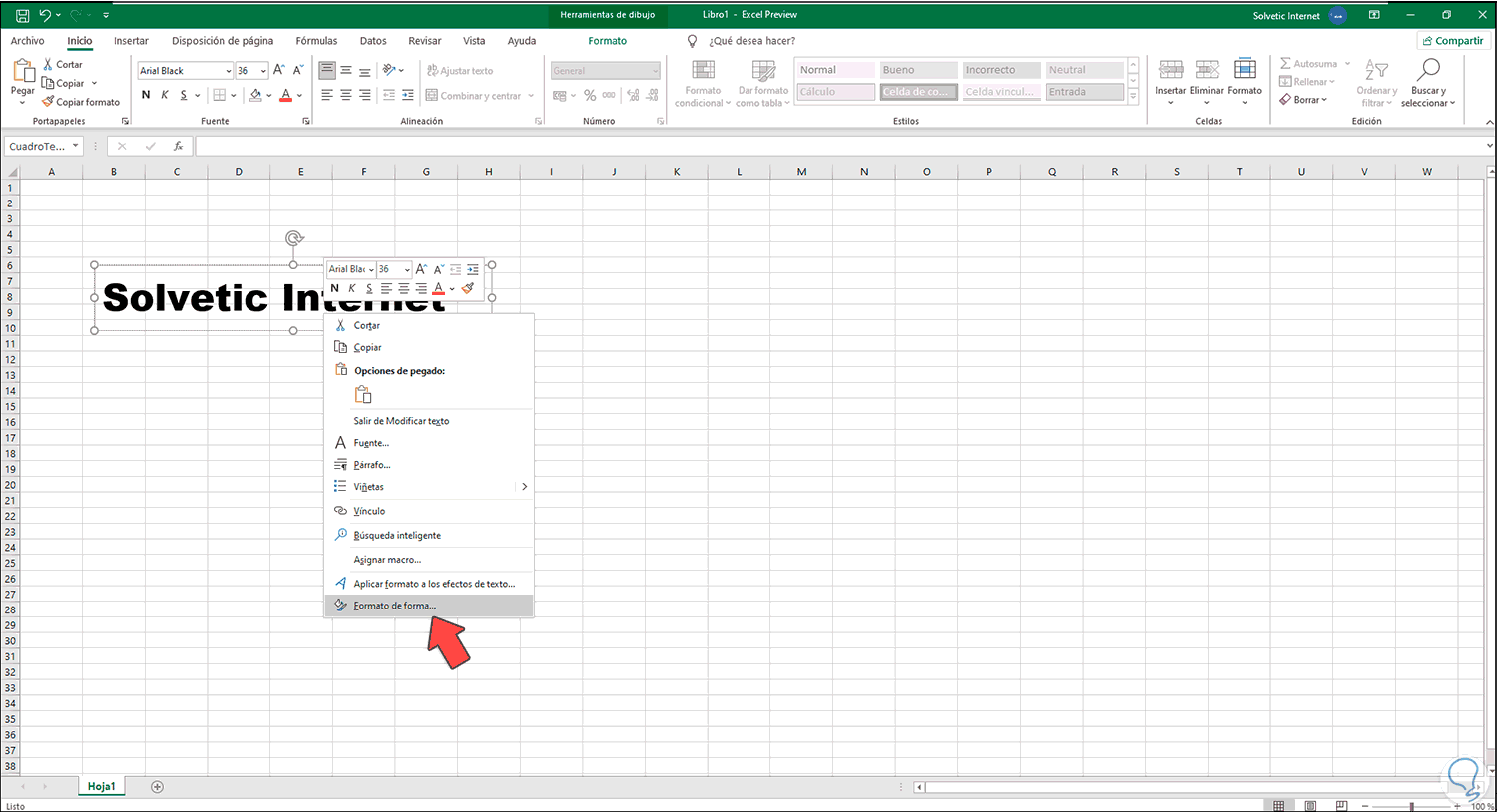 Una vez realizado esto, damos clic derecho sobre el texto y seleccionamos la opción "Formato de forma":