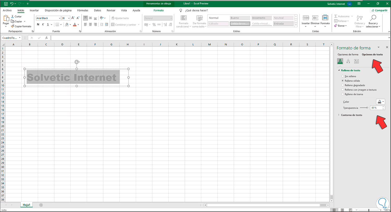 En el costado lateral derecho de la hoja de cálculo estarán disponibles las opciones de edición, allí vamos a "Opciones de texto", en Relleno de texto validamos que esté activo "Relleno sólido" y luego definimos el porcentaje de transparencia del texto: