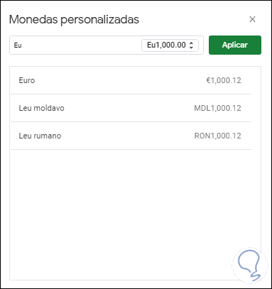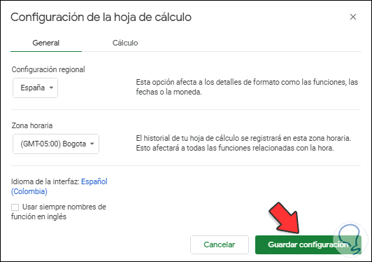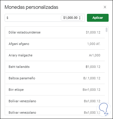 Este idioma afectará todos los parámetros de la cuenta de Google así como de las aplicaciones, en este caso las hojas de calculo o Google Sheets ahora dispondrán del formato de moneda del idioma seleccionado. Por ejemplo, si hemos seleccionado España será euro, si seleccionamos EEUU será dólar, etc, recordemos la importancia del formato de moneda para las tareas de cálculos y formulas disponibles allí.
