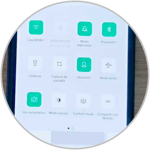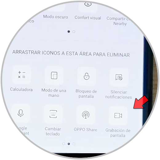 Vamos a desplazar la pantalla de arriba abajo para abrir el panel de accesos directos de nuestro Oppo. Vemos que no tenemos activo el icono de Grabadora por lo que vamos a entrar en el icono de edición de iconos.