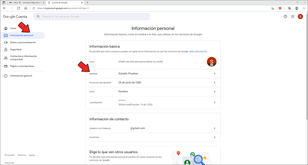 Esto nos abrirá la siguiente ventana. Allí vamos a la sección "Información personal" donde encontramos detalles puntuales de la cuenta. Damos clic en el campo "Nombre" y se desplegaran los valores de esta sección: