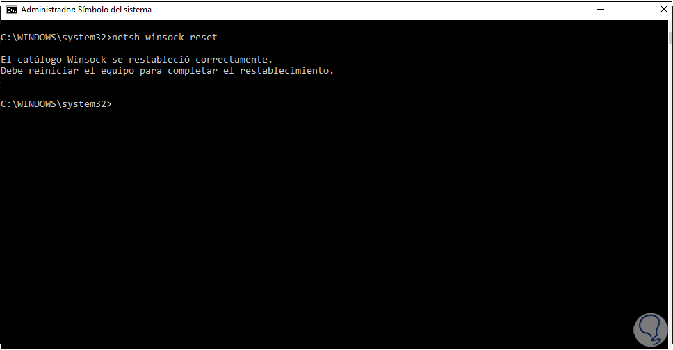 Ahora, ejecutamos el siguiente comando para restablecer el valor del socket del sistema winsock: