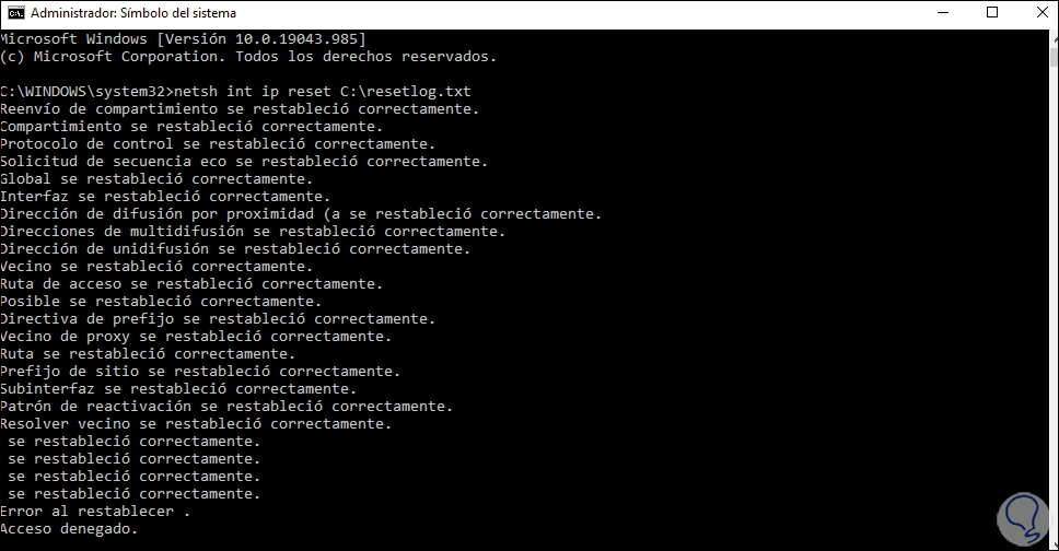 Este comando se encarga de restablecer algunas configuraciones de red a los valores predeterminados, pulsamos Enter y este será el resultado: