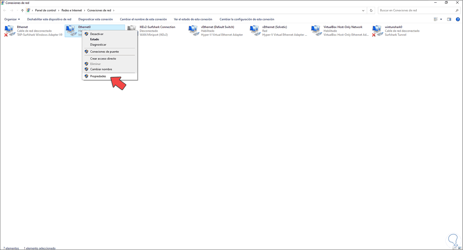 Damos clic en "Cambiar configuración del adaptador" y en la siguiente ventana daremos clic derecho sobre el adaptador de red actual y seleccionamos la opción "Propiedades":