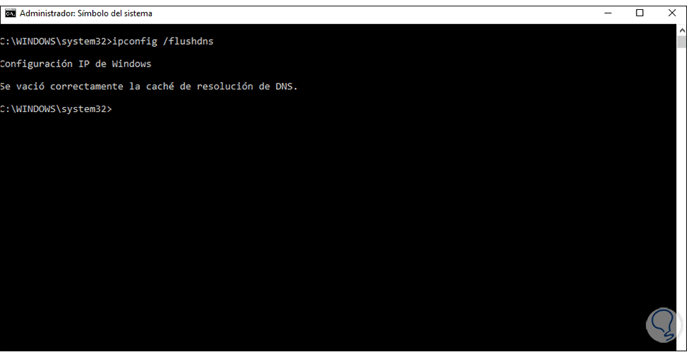 Después de esto, vaciamos la cache DNS del sistema, este es un tipo de elemento que se aloja en la configuración del navegador para ofrecer un acceso más efectivo a los sitios web pero con el paso del tiempo puede tener un efecto negativo en la búsqueda y descarga de actualizaciones a través de Windows Update, para esto ejecutamos: