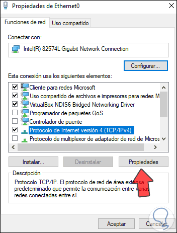 En la ventana emergente desplegada, seleccionamos el protocolo IPv4 y damos clic en "Propiedades":