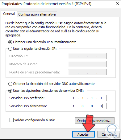 - En Servidor DNS alternativo ingresamos 1.0.0.1