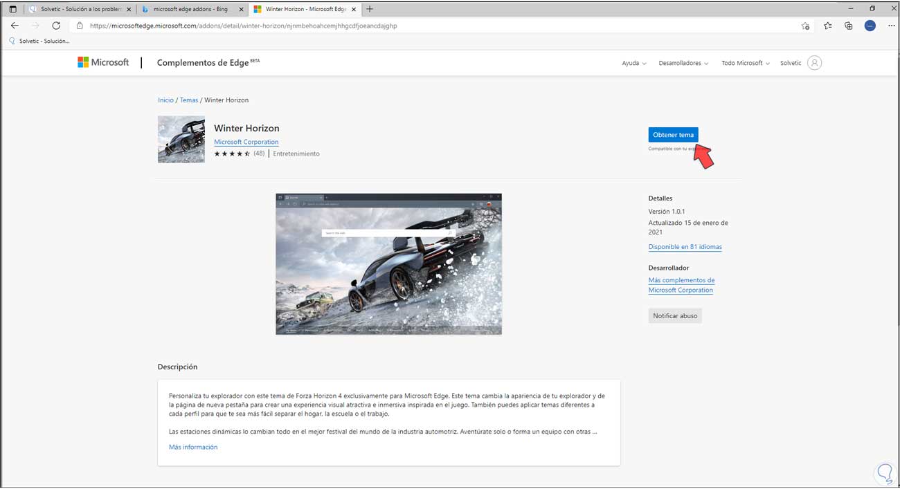 Al dar clic allí el tema se descargará e instalará en Microsoft Edge: