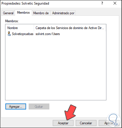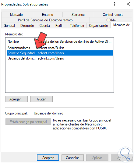 Ahora damos doble clic sobre el usuario, y en la pestaña "Miembro de" comprueba que está en el grupo de seguridad creado: