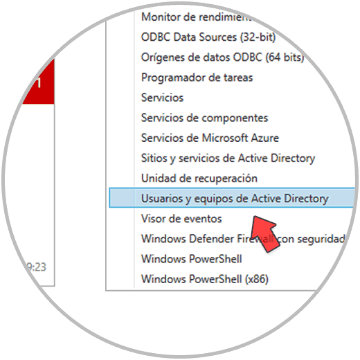 Para esto abrimos el Administrador del servidor y vamos a "Herramientas - Usuarios y equipos de Active Directory":