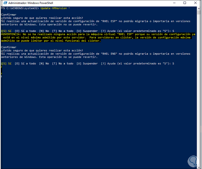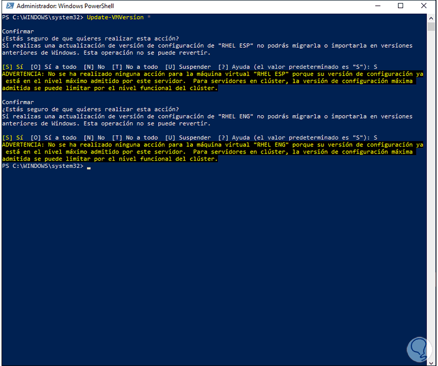 En este caso vemos que están en la versión más reciente, para actualizar a una nueva versión vamos a ejecutar lo siguiente en PowerShell: