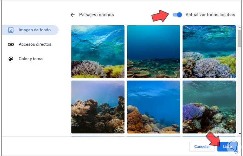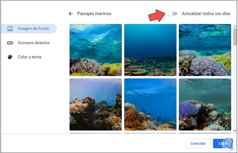 Activamos la primera imagen para aplicarla en Chrome inmediatamente y para que esta se cambie automáticamente, activamos el interruptor "Actualizar todos los días":