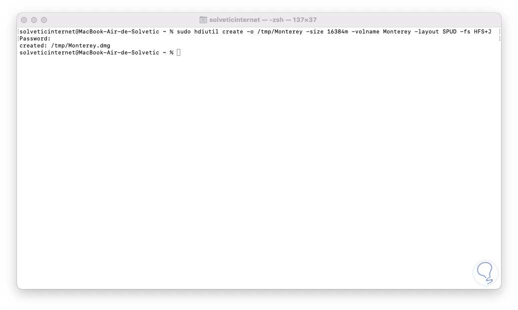 Con este validado, es momento de crear la imagen ISO, para esto abrimos la terminal en macOS. En la terminal, lo primero a hacer será crear el archivo temporal de Monterey con sus parámetros como tamaño, sistema de archivos y nombre: