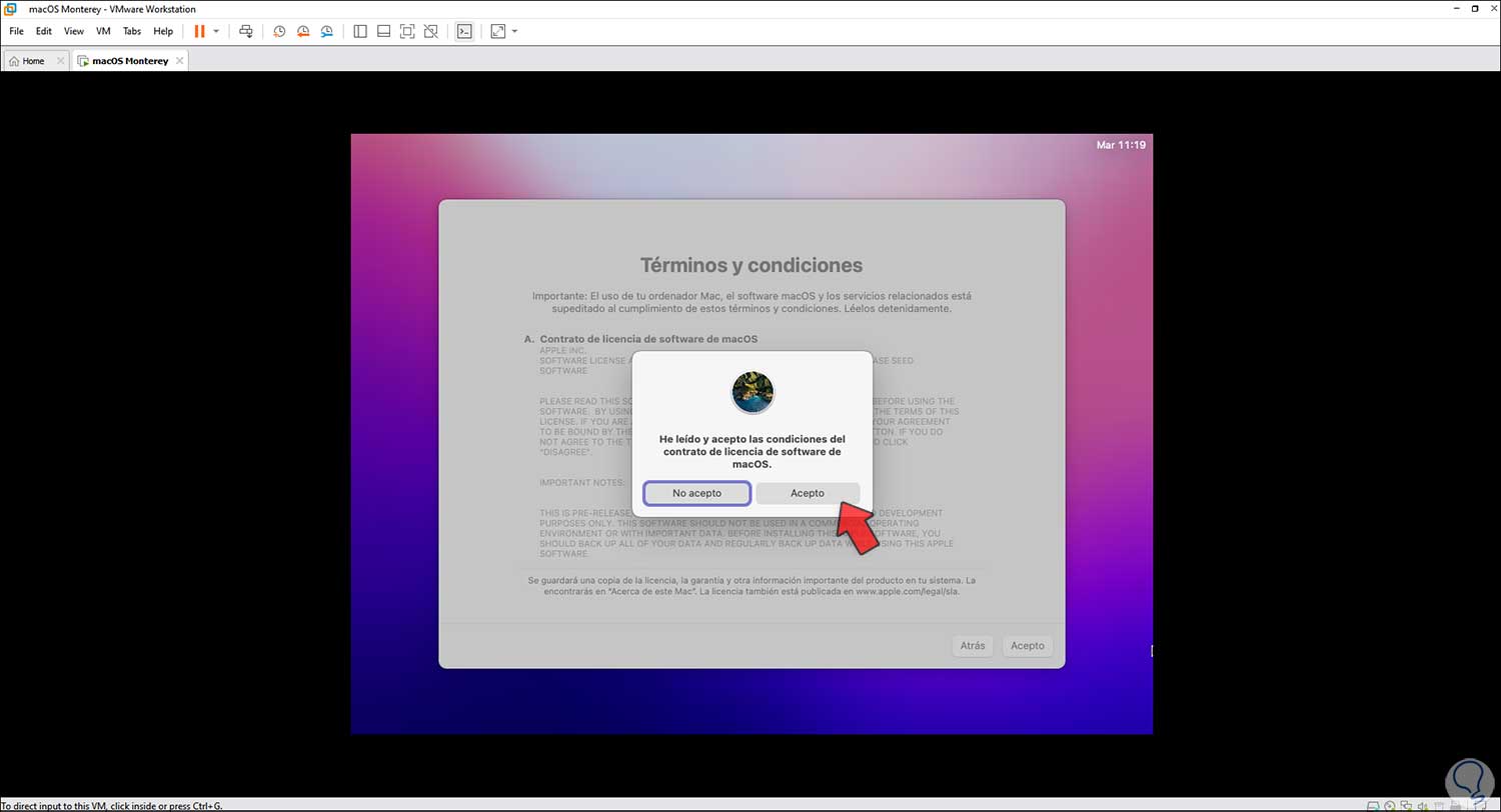 Clic en Continuar y ahora debemos aceptar la licencia de uso de macOS: