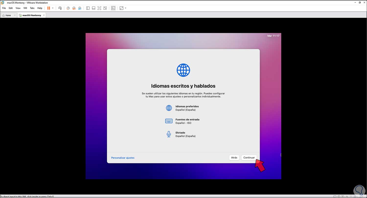 Damos clic en Continuar para iniciar el proceso de instalación en VMware: