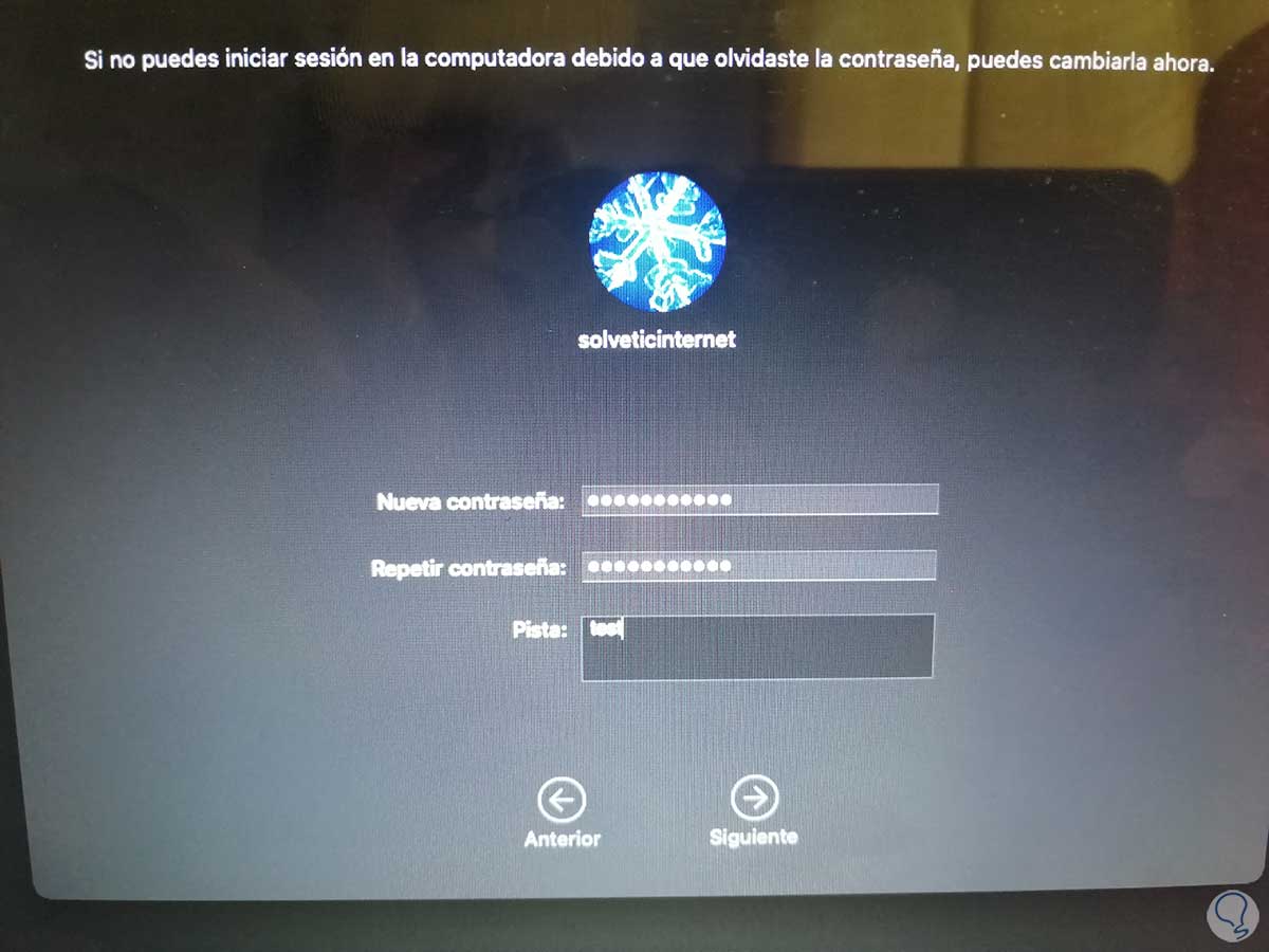 En la siguiente ventana ingresamos la nueva contraseña y algún indicio de esta: