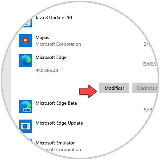 Allí pulsamos en "Microsoft Edge" y se activarán diversas opciones, debemos dar clic en "Modificar":