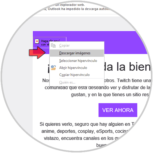 Después de esto, damos clic derecho sobre el mensaje y seleccionamos la opción "Descargar imágenes" para ver la imagen en mención: