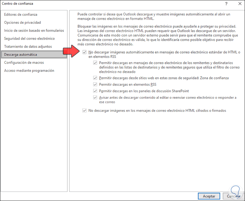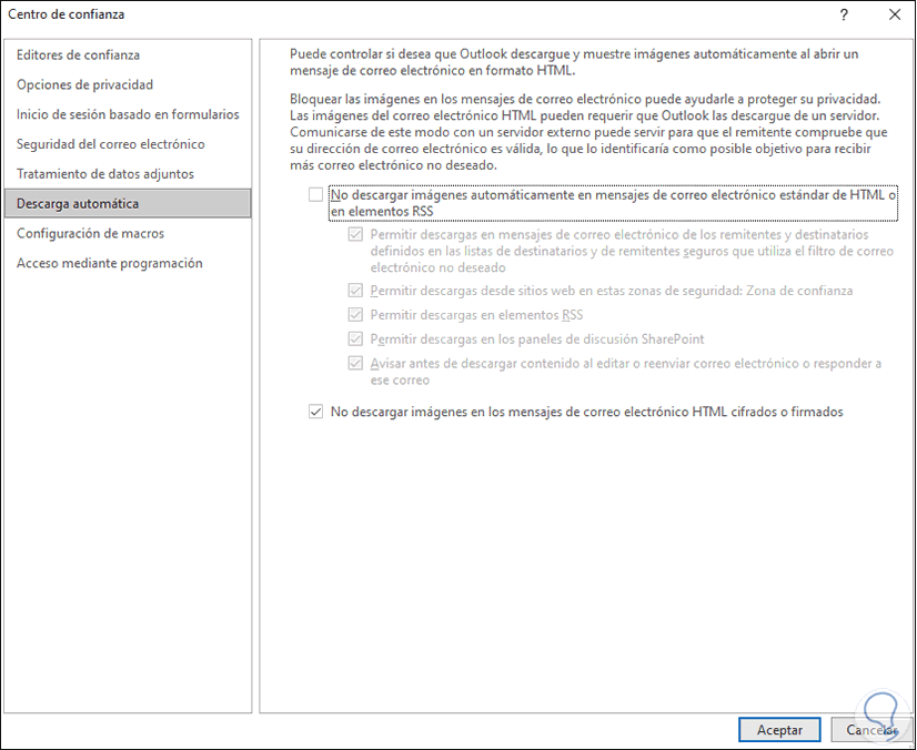Allí vamos a deshabilitar la casilla ""No descargar imágenes automáticamente en mensajes de correo electrónico estándar de HTML o en elementos RSS". Aplica los cambios.