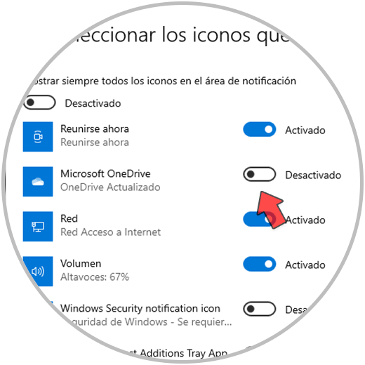 Activa el interruptor de OneDrive para hacerlo visible. El icono debe estar disponible en la barra de tareas.