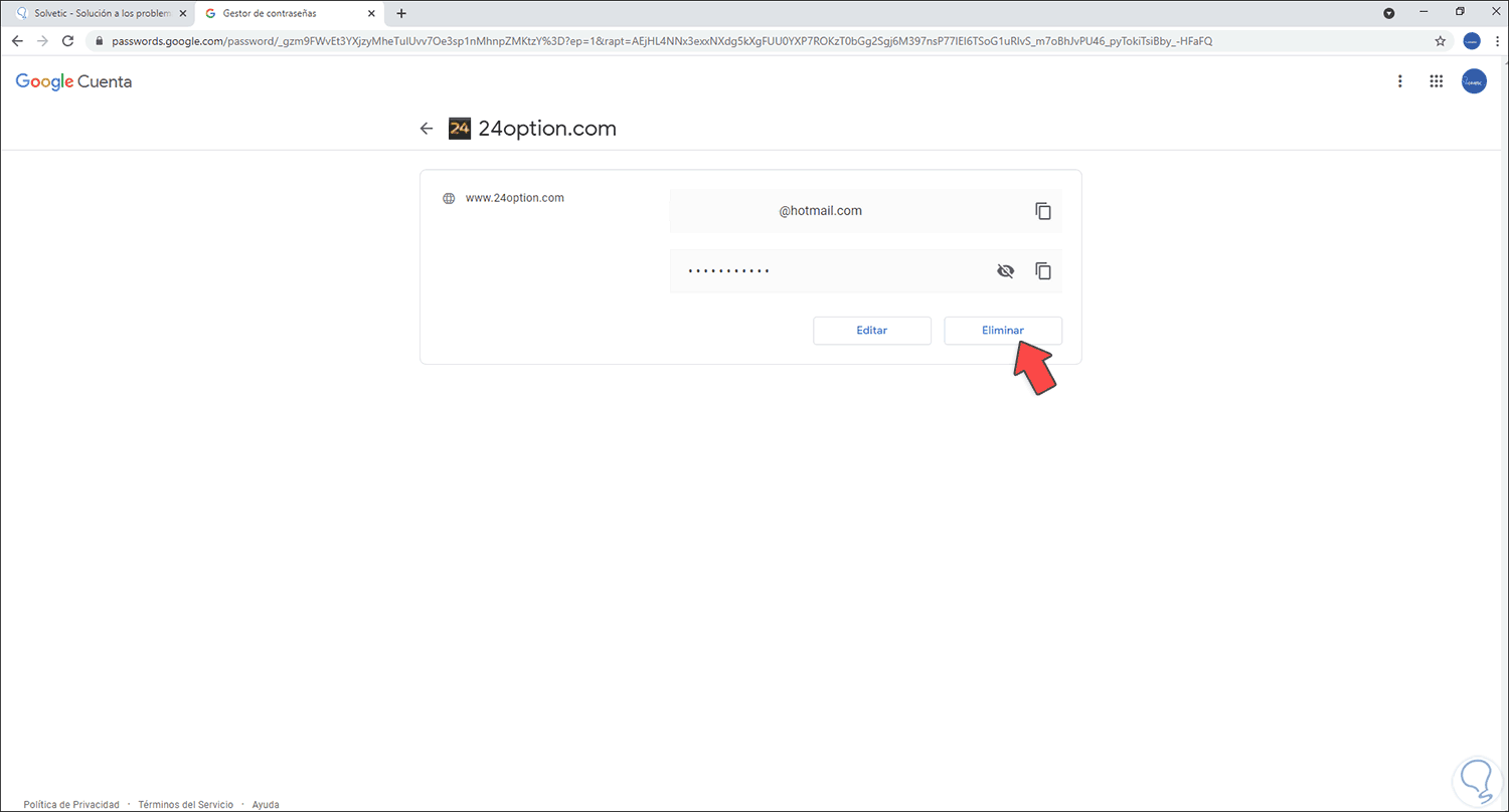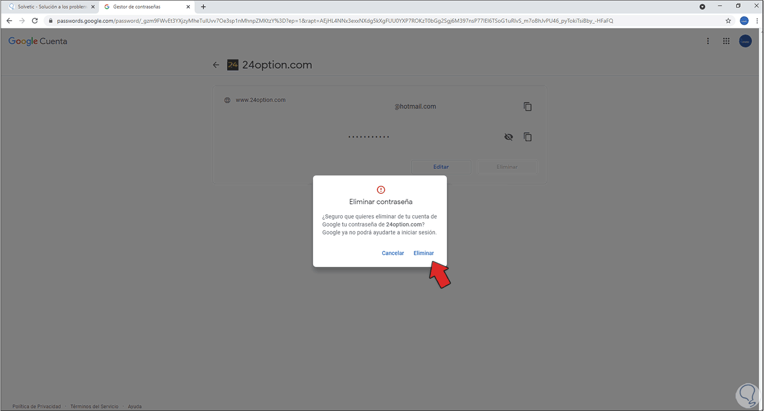 Si deseamos podemos ver la contraseña guardada, para borrar la cuenta y contraseña damos clic en "Eliminar" y se desplegara la siguiente ventana: