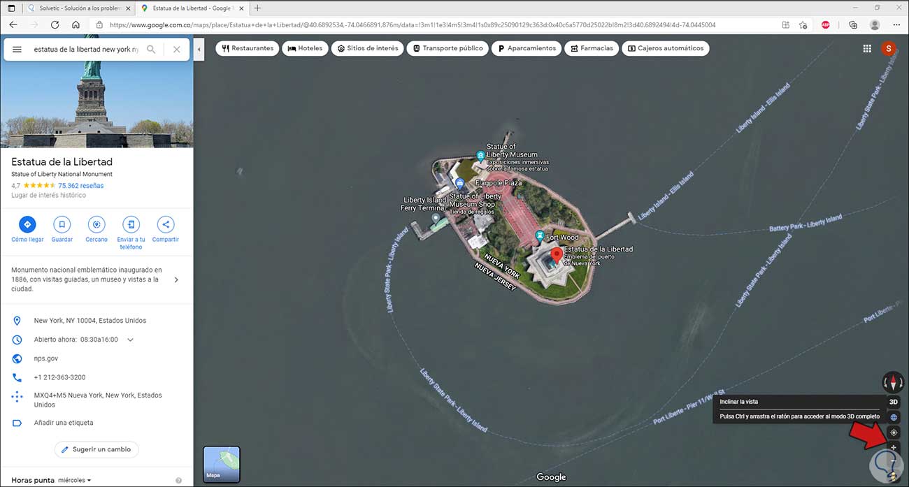 Con la tecla Ctrl + el mouse es posible navegar en 3D sobre el lugar que hemos seleccionado en Google Maps: