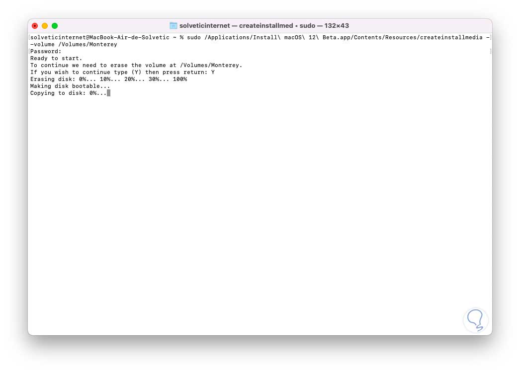 Ingresamos la letra Y para crear el medio USB de arranque de macOS Monterey, en primer lugar, el disco será borrado: