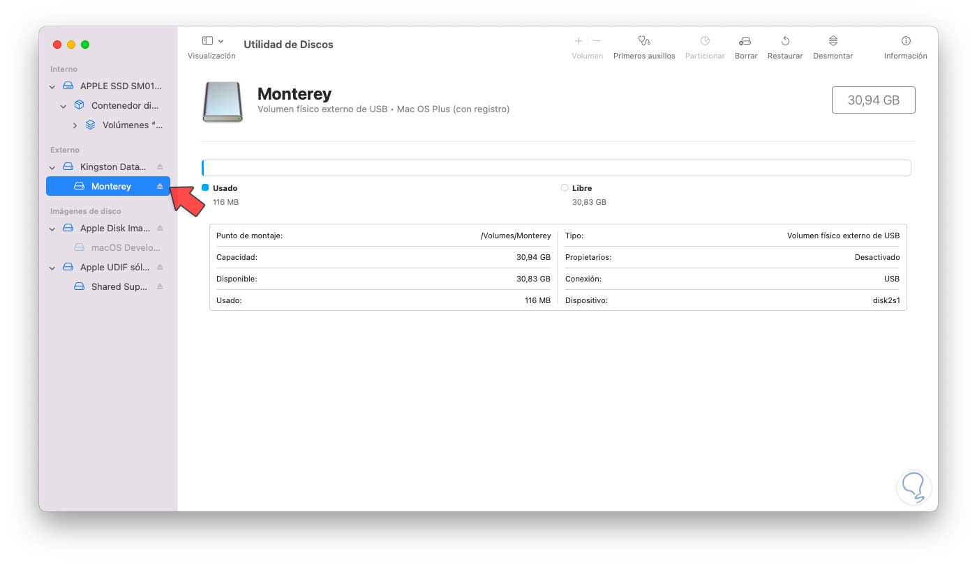 Con esto definido, vamos a configurar el medio USB para que pueda ser usado en los equipos Mac, esto implica configurar de forma correcta su sistema de archivos y demás valores, para ello vamos a abrir la Utilidad de discos.
