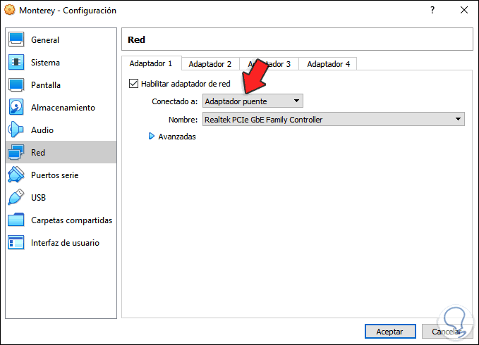 En la sección Red activamos el adaptador puente para establecer conexión con el equipo físico: