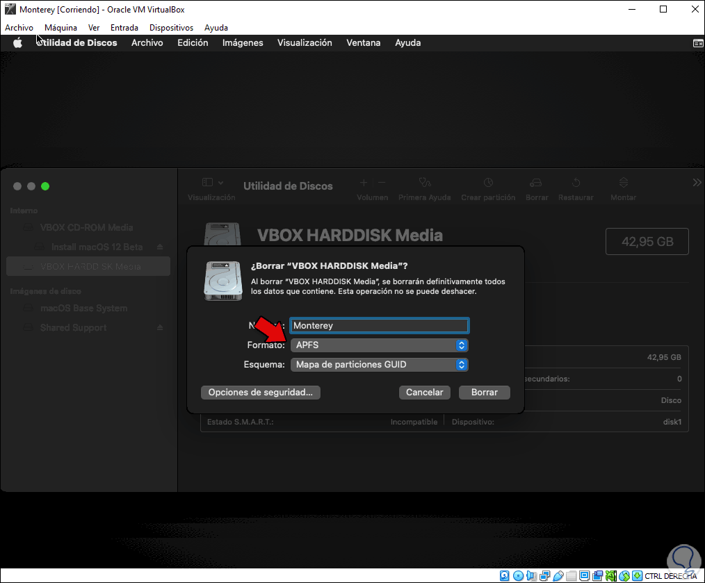 Damos clic en "Borrar", asignamos nombre, dejamos el formato APFS y aplicamos los cambios: