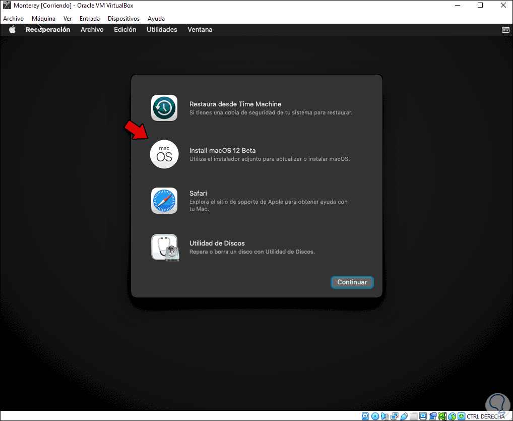 Salimos de Utilidad de Discos y ahora seleccionamos "Instalar macOS 12 Beta":
