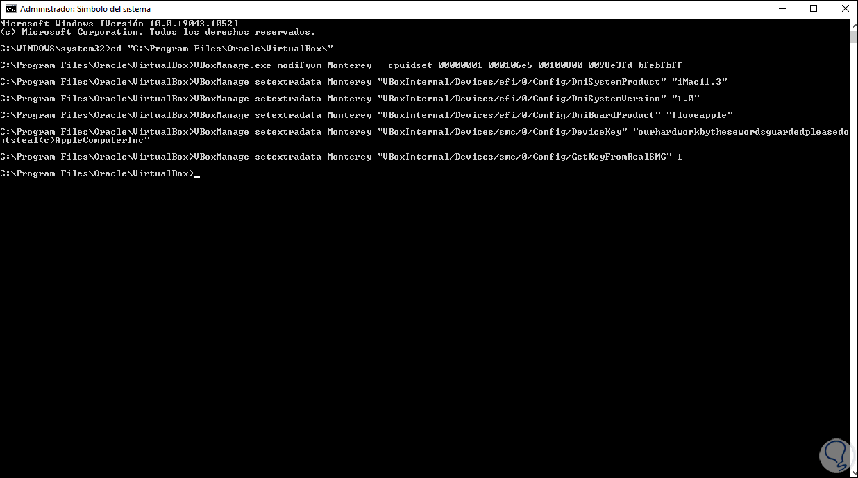 cd "C:\Program Files\Oracle\VirtualBox\" VBoxManage.exe modifyvm Monterey --cpuidset 00000001 000106e5 00100800 0098e3fd bfebfbff VBoxManage setextradata Monterey "VBoxInternal/Devices/efi/0/Config/DmiSystemProduct" "iMac11,3" VBoxManage setextradata Monterey "VBoxInternal/Devices/efi/0/Config/DmiSystemVersion" "1.0" VBoxManage setextradata Monterey "VBoxInternal/Devices/efi/0/Config/DmiBoardProduct" "Iloveapple" VBoxManage setextradata Monterey "VBoxInternal/Devices/smc/0/Config/DeviceKey" "ourhardworkbythesewordsguardedpleasedontsteal(c)AppleComputerInc" VBoxManage setextradata Monterey "VBoxInternal/Devices/smc/0/Config/GetKeyFromRealSMC" 1