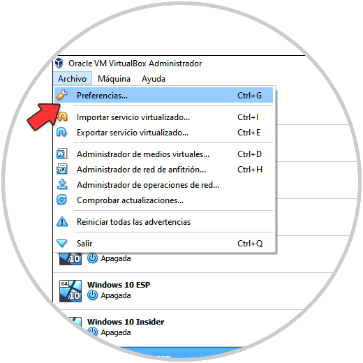 Para comprobar esto abrimos VirtualBox y vamos al menú "Archivo - Preferencias":