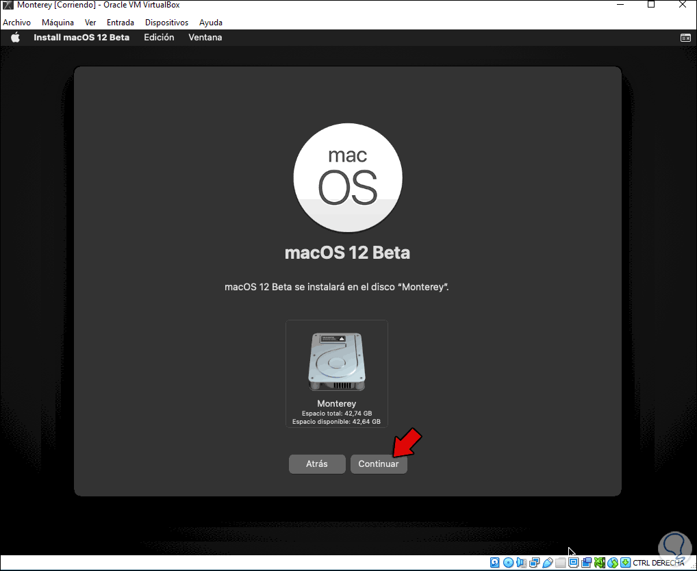 Damos clic en Continuar para seleccionar el disco donde se instalar macOS Monterey: