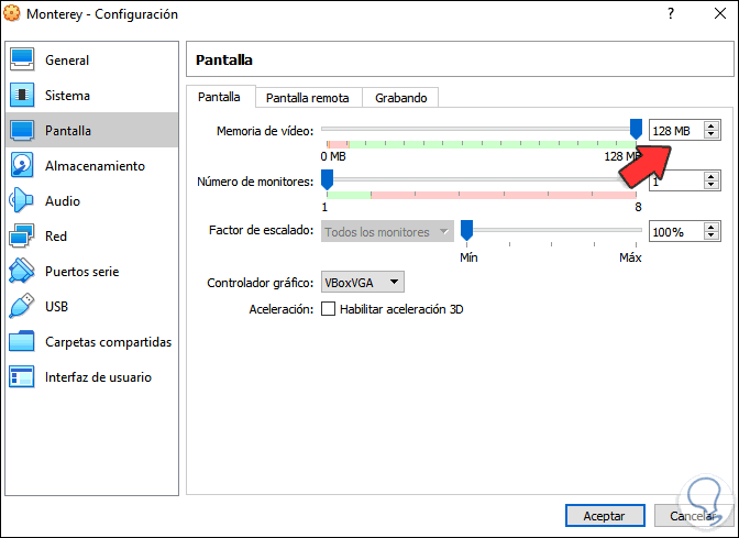 Vamos a la sección Pantalla, allí en "Memoria de video" asigna 128 MB: