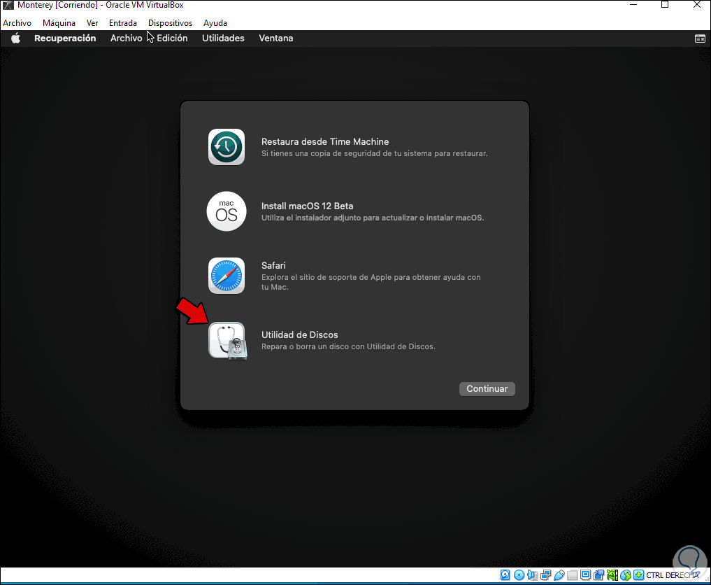 Seleccionamos "Utilidad de Discos" y después seleccionamos el disco duro virtual: