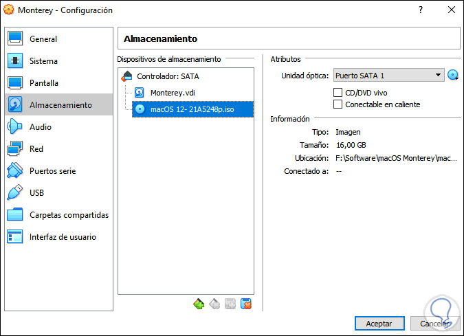 Damos clic en el icono lateral para seleccionar la ISO de macOS 12 Beta (Monterey):