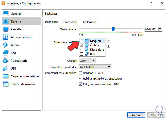 Vamos a la configuración de la máquina desde el botón “Configuración”, en la sección Sistema desactiva la casilla "Disquete":