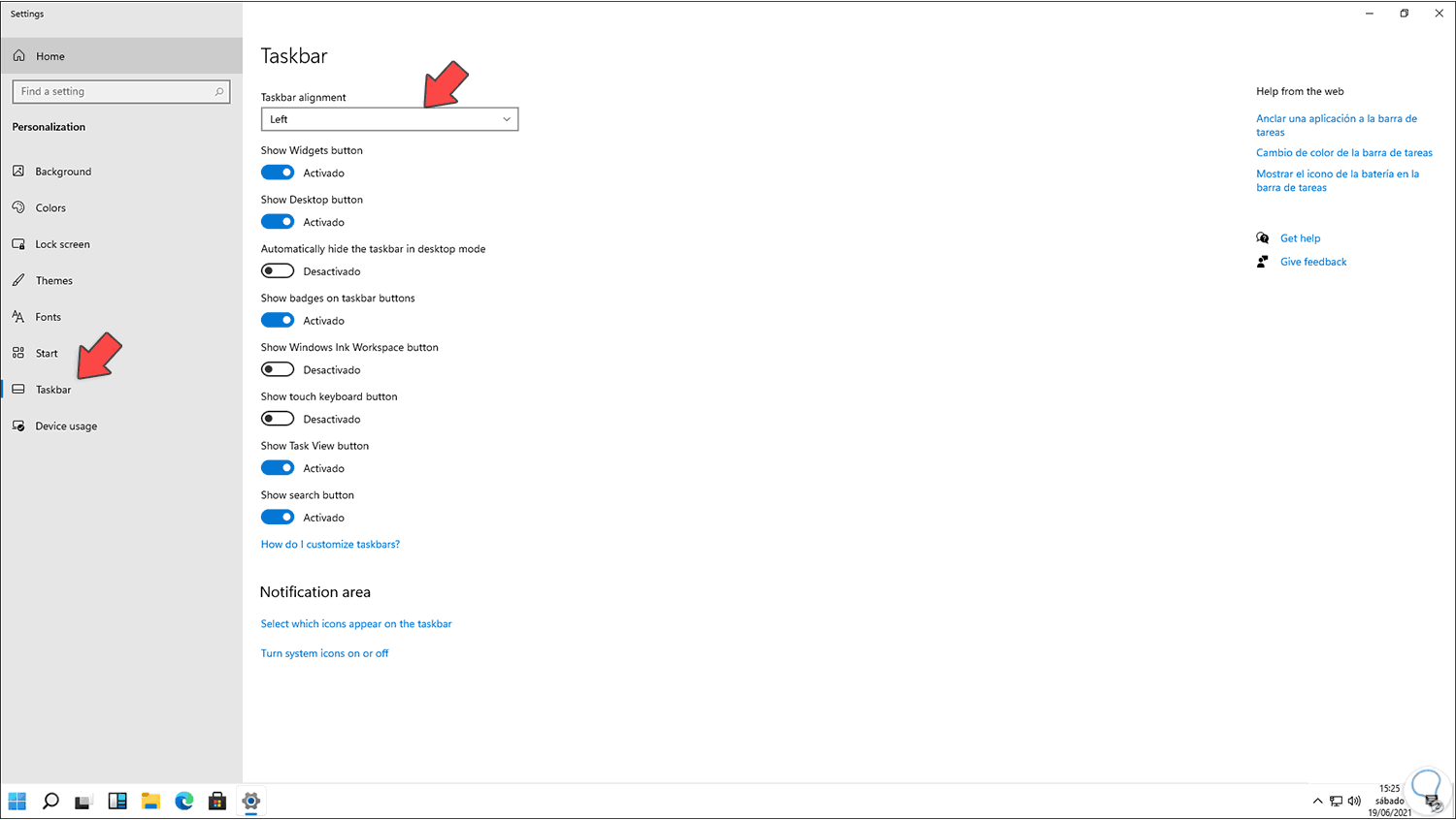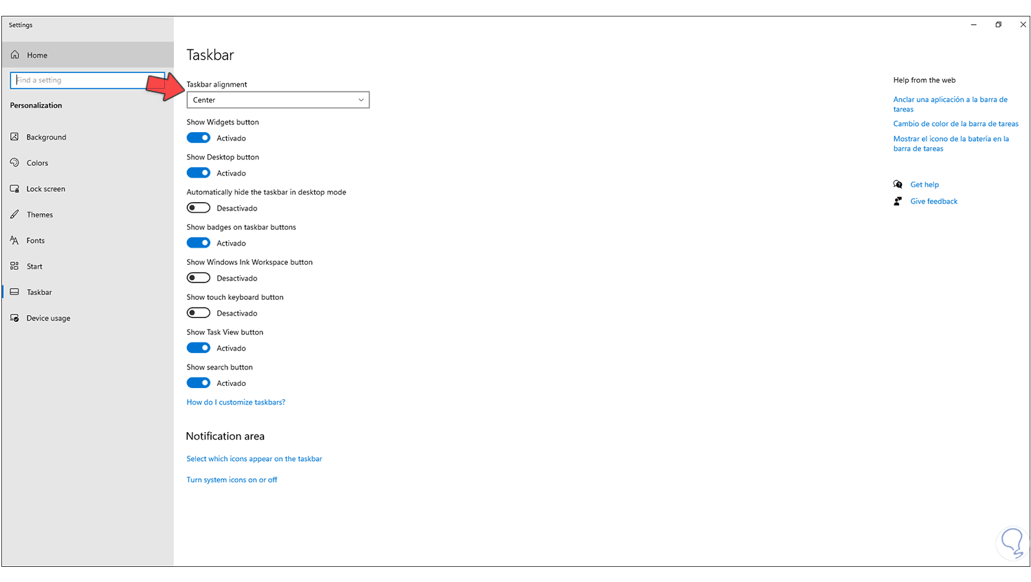 Por defecto su valor es centrado (Center), allí podemos alinear a la izquierda la barra de tareas seleccionando Left: