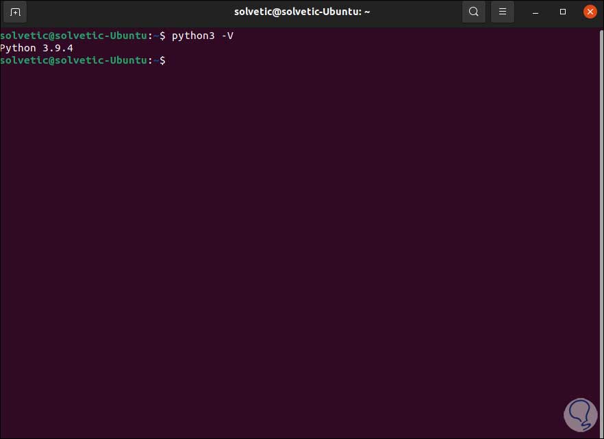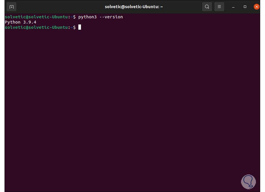 Como mencionamos, Python está integrado por defecto en las versiones de Ubuntu, es Python 3, para saber la versión exacta abrimos la terminal en Ubuntu: