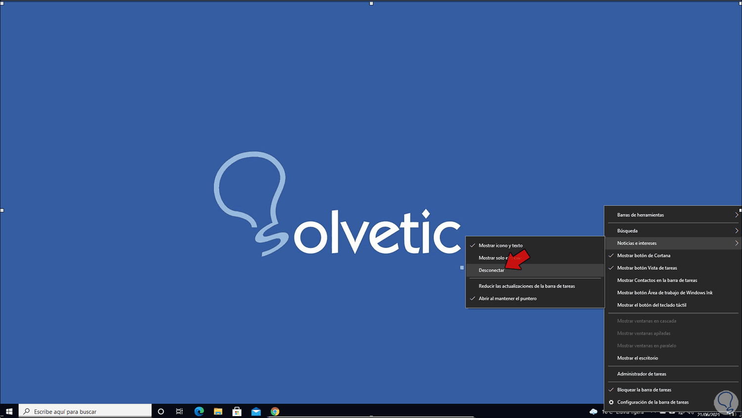 Es uno de los métodos más sencillos, para este damos clic derecho sobre la barra de tareas y luego vamos a "Noticias e intereses" y después damos clic en "Desconectar":