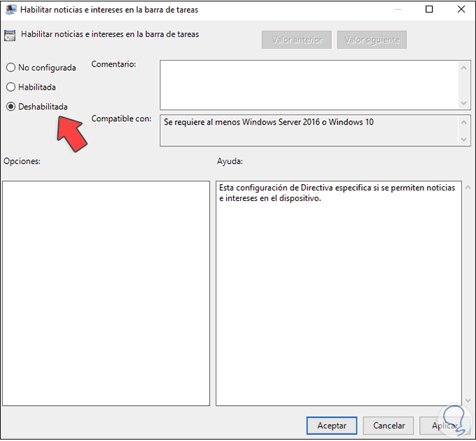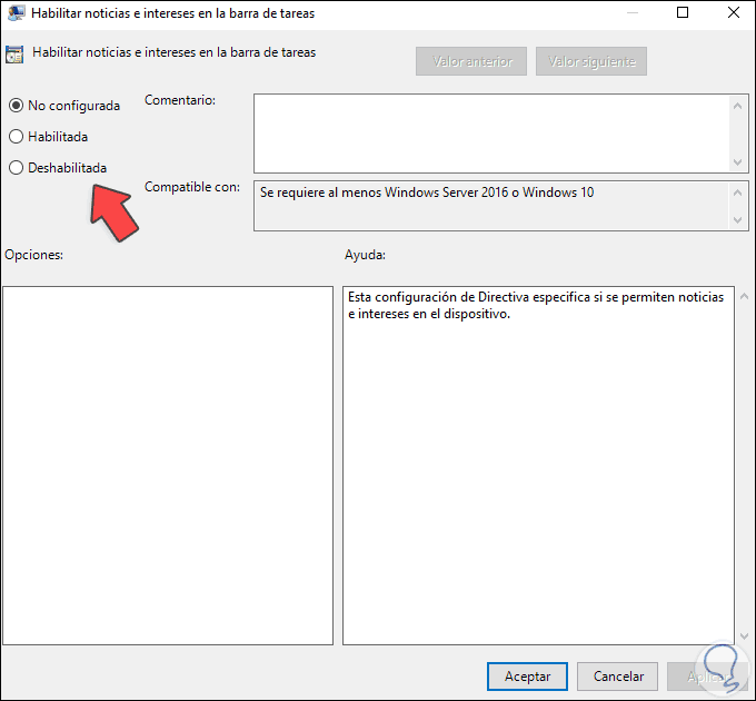 En el panel izquierdo damos doble clic en la política "Habilitar noticias e intereses en la barra de tareas" y se abrirá la siguiente ventana: