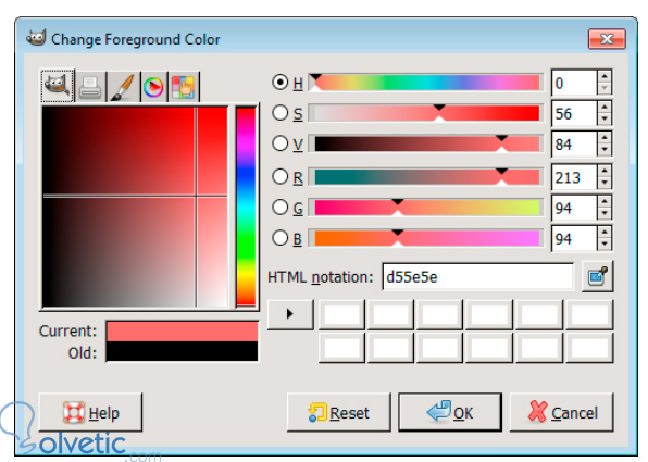 Para llegar a esta herramienta simplemente debemos hacer click en alguno de los dos colores que tenemos en la caja de herramientas a nuestro lado izquierdo y veremos lo siguiente: