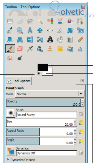Podemos fijarnos también que aparte de los diferentes colores, tenemos varias opciones que nos permiten aplicar dicho color sobre nuestro lienzo o canvas, dichas opciones van a depender también de si elegimos la brocha o el lápiz por ejemplo en las herramientas de dibujo de Gimp.
