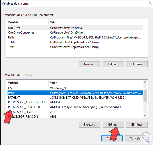 Allí seleccionamos la línea "PATH" y damos clic en "Editar":