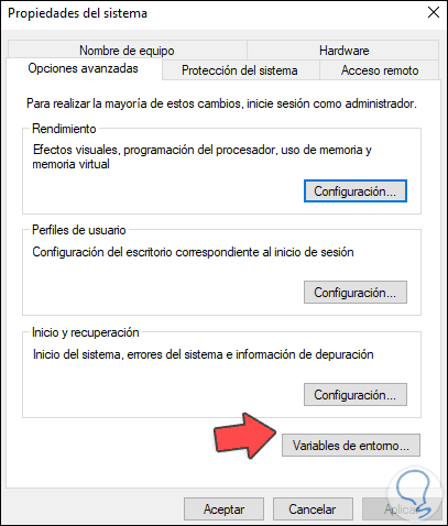 Seleccionamos "Editar las variables de entorno del sistema" y se abrirá la siguiente ventana: